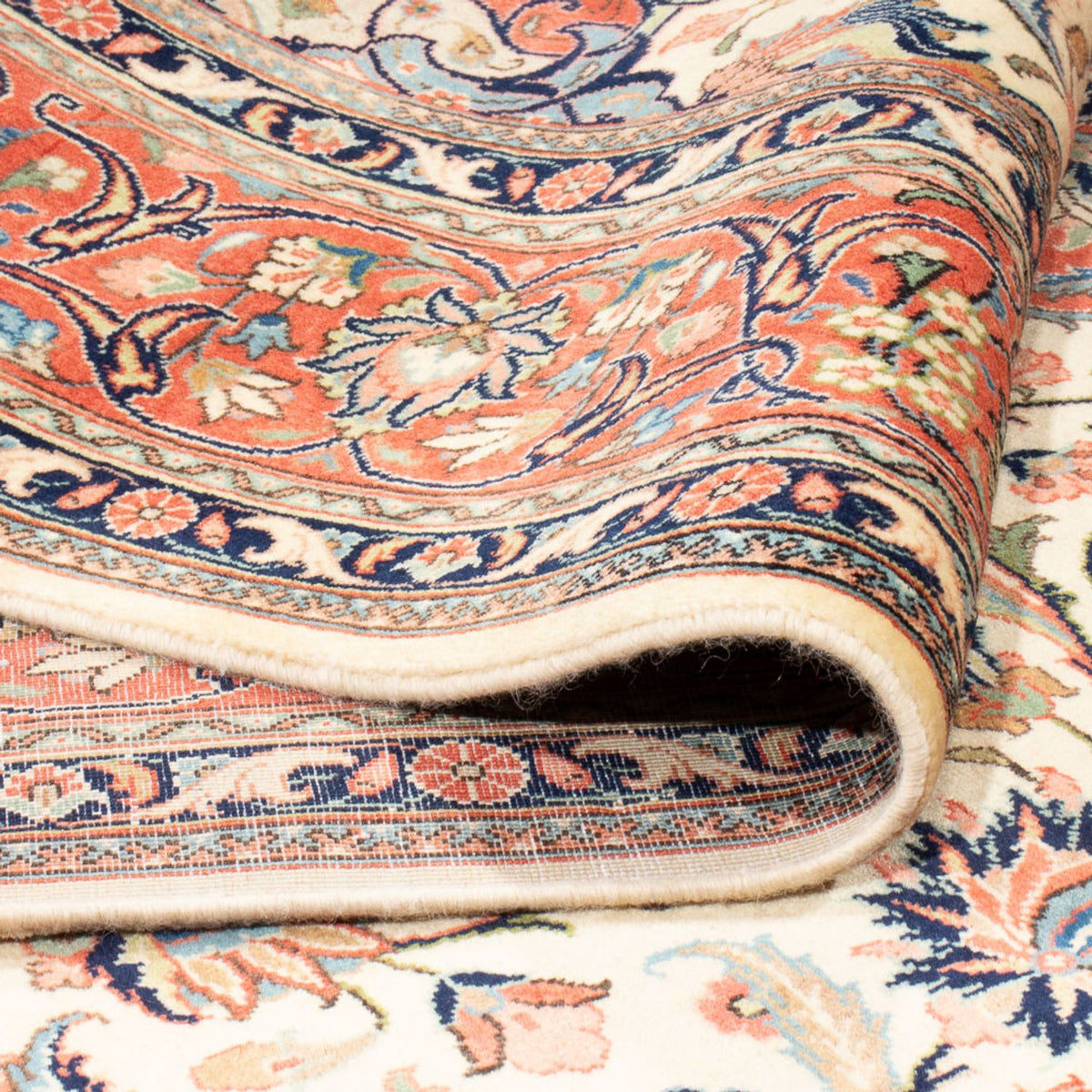 Sarough gehört zu den wichtigsten Teppich-Provenienzen des Iran. Der Sarough verbindet modernes Wohnen mit traditioneller Knüpfkunst. Durch seine robuste Knüpfung ist der Sarough ein strapazierfähiger Teppich mit hoher Schall- und Wärmeisolierung. Die verwendete Wolle hat eine hohe Qualität, ist glänzend und die Teppiche sind robust und strapazierfähig. Die Knüpfungen sind sehr fein und der Flor relativ hoch. Sein zeitloses Design fügt sich problemlos in die Umgebung ein und verleiht ihr ein behagliches Wohngefühl. Heute werden in Sarough Teppiche verschiedenster Qualitäten geknüpft. Die Mustervielfalt der Teppiche gehört zu den reichhaltigsten und traditionellsten des ganzen Orients und kann somit nicht verallgemeinert werden. Bekannt sind sie für Ihre wunderschönen Medaillons, sowie auch für das bekannte durchgemusterte Mir Muster.