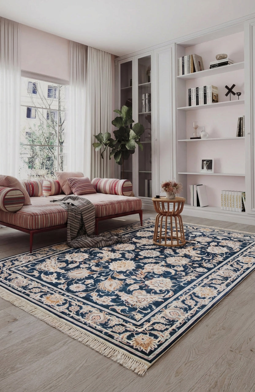 Le tapis d'Orient "Aryana", d'un bleu subtil, disponible en tapis rectangulaire ou en tapis de passage, allie des motifs traditionnels à une palette de couleurs modernes, créant ainsi une atmosphère élégante dans votre maison. Grâce à sa finition de qualité, "Aryana" est durable et confortable. Idéal pour le salon, la chambre à coucher ou les couloirs, ce tapis s'intègre harmonieusement dans différents styles d'aménagement. Parfait pour tous ceux qui attachent de l'importance à la qualité et au design attrayant.