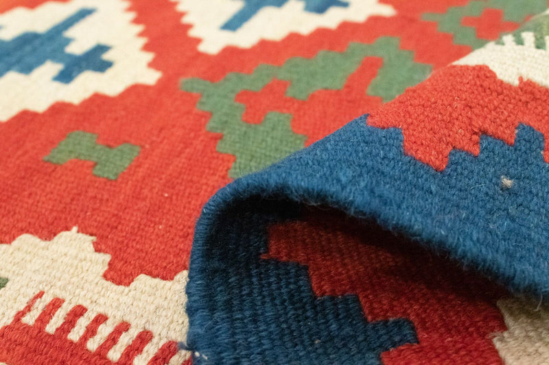 Dieser kunstvolle Kelim - Oriental besticht das Auge mit seinen angesagten Farben. So bringt er eine moderne und harmonische Eleganz in Ihr Wohnambiente mit ein. Kelim Teppiche sind im Gegensatz zu klassischen Orientteppichen in traditioneller Art handgewebt statt geknüpft. In anderen Ländern werden diese Exemplare auch als Kissen oder Vorhänge genutzt. Diese Teppiche haben einen dünnen Flor, für das feste Obergewebe wird 100% Schurwolle verwendet, welche von Natur aus äußerst pflegeleicht und strapazierbar ist. Als echten Kelim bezeichnen Experten nur Teppiche, welche in der Türkei, dem Kaukasusgebiet, Persien, Afghanistan und Turkmenien hergestellt wurden. Echte Teppiche aus dem Orient eben.