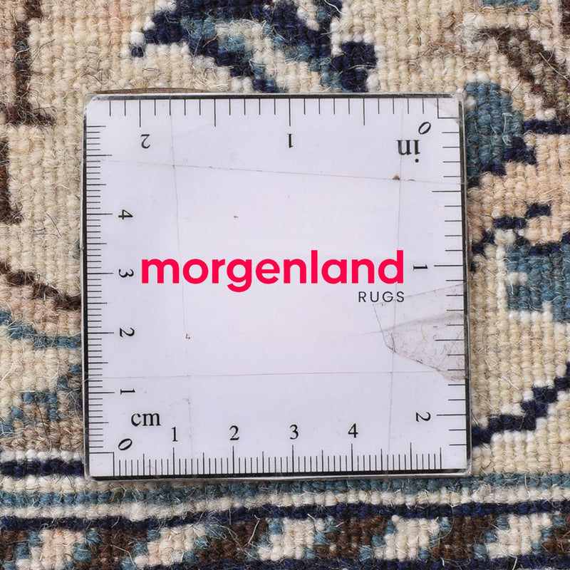 Nain Teppiche werden in hervorragender Feinheit geknüpft. Als Flormaterial wird meist beste, samtartige Korkwolle und immer Seide verwendet, damit eine exakte Musterung von Medaillons und All-Over-Musterung ausgeführt werden kann. Man unterscheidet den Nain in 4 Qualitätsstufen, die in „La“ angegeben werden. 4La, 6La, 9La, 12La. Dies ist eine Qualitätsbezeichnung und bezieht sich auf die Anzahl der Faden Schichten, die in jedem Kettfäden enthalten sind. Je geringerer die angegebene Zahl ist, desto höher die Knotendichte, desto feiner und dichter ist der Teppich. Nains gehören zu den Schönsten auf der Welt. Sie sind auch bei Sammlern sehr beliebt. Durch ihre schlichte Eleganz passen Nains auch in moderne Einrichtungen und bringen Luxus ins Haus.