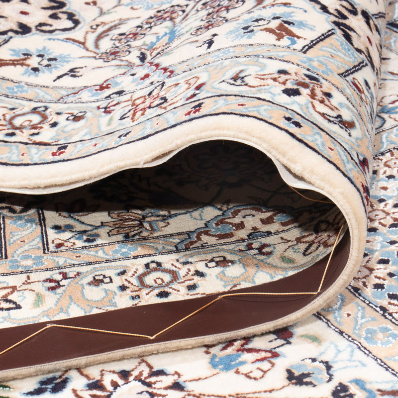 Dieser schöne und selten fein geknüpfte Perserteppich – Nain – Premium gehört zur höchsten Qualitätsstufe 4 mit circa 890.000 bis 1.000.000 Knoten pro Quadratmeter. Dem feinen Nain 6La, ist der Ruhm der Provenienz zu verdanken. Er gilt im gesamten Orient als besonders hochwertiger persischer Teppich. Nain Teppiche werden in hervorragender Feinheit geknüpft. Als Flormaterial wird meist beste, samtartige Korkwolle und immer Seide verwendet, damit eine exakte Musterung von Medaillons und All Over-Musterung ausgeführt werden kann. Man unterscheidet den Nain in 4 Qualitätsstufen, die in „La“ angegeben werden. 4La, 6La, 9La, 12La. Dies ist eine Qualitätsbezeichnung und bezieht sich auf die Anzahl der Fadenschichten, die in jedem Kettenfaden enthalten sind. Je geringerer die angegebene Zahl ist, desto feiner und dichter ist der Teppich. Nains gehören zu den Schönsten auf der Welt. Sie sind bei Sammlern sehr beliebt. Durch ihre schlichte Eleganz passen Nains auch in moderne Einrichtungen.