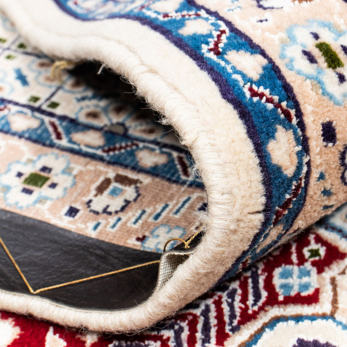 Die handgesponnene Wolle verleiht dem Teppich eine einzigartige, leicht strukturierte Oberfläche mit dezentem Glanz – ein Zeichen echter Handwerkskunst. Gleichzeitig wirkt das Material temperaturausgleichend, schmutzabweisend und sorgt für ein behagliches Raumklima.