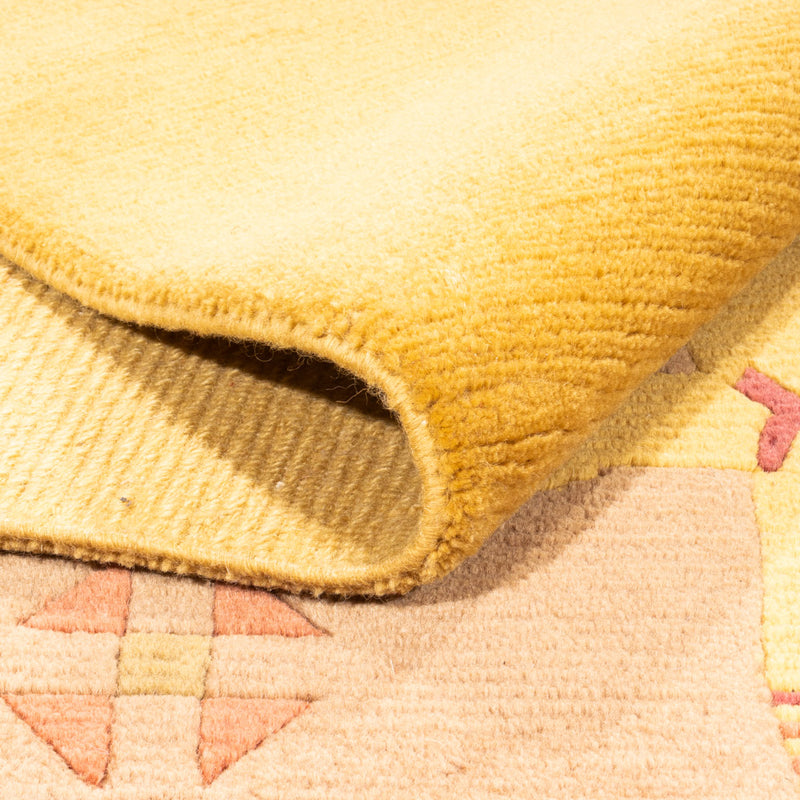 Die handgesponnene Wolle verleiht dem Teppich eine einzigartige, leicht strukturierte Oberfläche mit dezentem Glanz – ein Zeichen echter Handwerkskunst. Gleichzeitig wirkt das Material temperaturausgleichend, schmutzabweisend und sorgt für ein behagliches Raumklima.