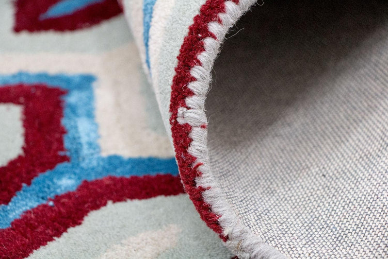 Die handgesponnene Wolle verleiht dem Teppich eine einzigartige, leicht strukturierte Oberfläche mit dezentem Glanz – ein Zeichen echter Handwerkskunst. Gleichzeitig wirkt das Material temperaturausgleichend, schmutzabweisend und sorgt für ein behagliches Raumklima.