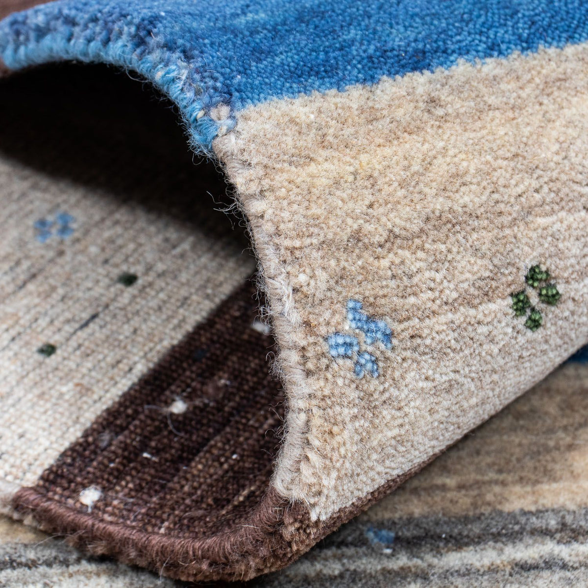 Die handgesponnene Wolle verleiht dem Teppich eine einzigartige, leicht strukturierte Oberfläche mit dezentem Glanz – ein Zeichen echter Handwerkskunst. Gleichzeitig wirkt das Material temperaturausgleichend, schmutzabweisend und sorgt für ein behagliches Raumklima.