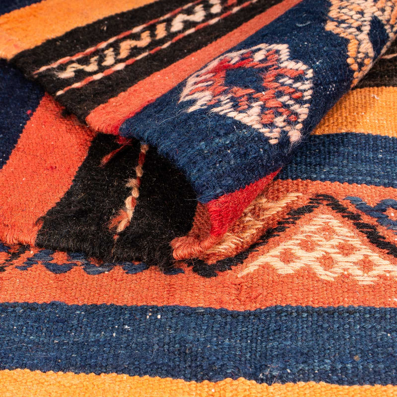 Dieser kunstvolle Kelim - Old besticht das Auge mit seinen angesagten Farben. So bringt er eine moderne und harmonische Eleganz in Ihr Wohnambiente mit ein. Kelim Teppiche sind im Gegensatz zu klassischen Orientteppichen in traditioneller Art handgewebt statt geknüpft. In anderen Ländern werden diese Exemplare auch als Kissen oder Vorhänge genutzt. Diese Teppiche haben einen dünnen Flor, für das feste Obergewebe wird 100% Schurwolle verwendet, welche von Natur aus äußerst pflegeleicht und strapazierbar ist. Als echten Kelim bezeichnen Experten nur Teppiche, welche in der Türkei, dem Kaukasusgebiet, Persien, Afghanistan und Turkmenien hergestellt wurden. Echte Teppiche aus dem Orient eben.
