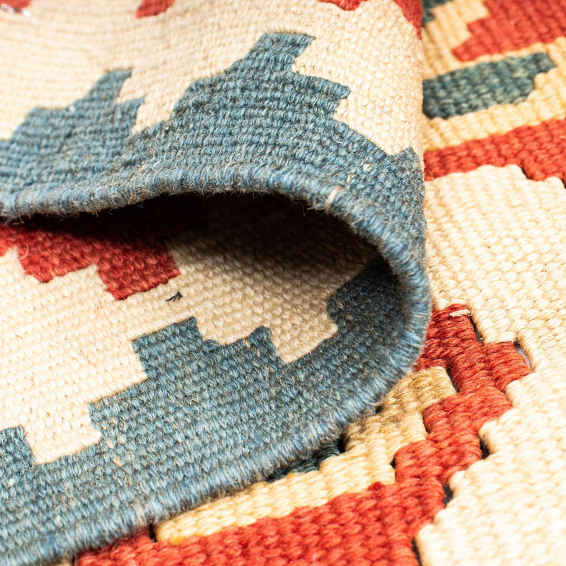 Dieser kunstvolle Kelim - Oriental besticht das Auge mit seinen angesagten Farben. So bringt er eine moderne und harmonische Eleganz in Ihr Wohnambiente mit ein. Kelim Teppiche sind im Gegensatz zu klassischen Orientteppichen in traditioneller Art handgewebt statt geknüpft. In anderen Ländern werden diese Exemplare auch als Kissen oder Vorhänge genutzt. Diese Teppiche haben einen dünnen Flor, für das feste Obergewebe wird 100% Schurwolle verwendet, welche von Natur aus äußerst pflegeleicht und strapazierbar ist. Als echten Kelim bezeichnen Experten nur Teppiche, welche in der Türkei, dem Kaukasusgebiet, Persien, Afghanistan und Turkmenien hergestellt wurden. Echte Teppiche aus dem Orient eben.