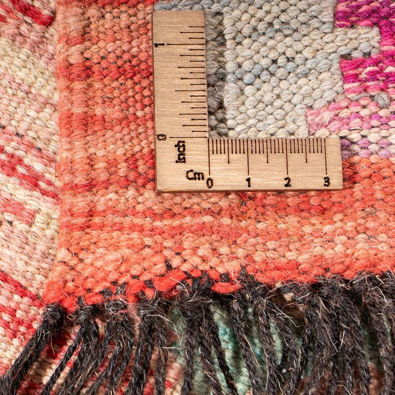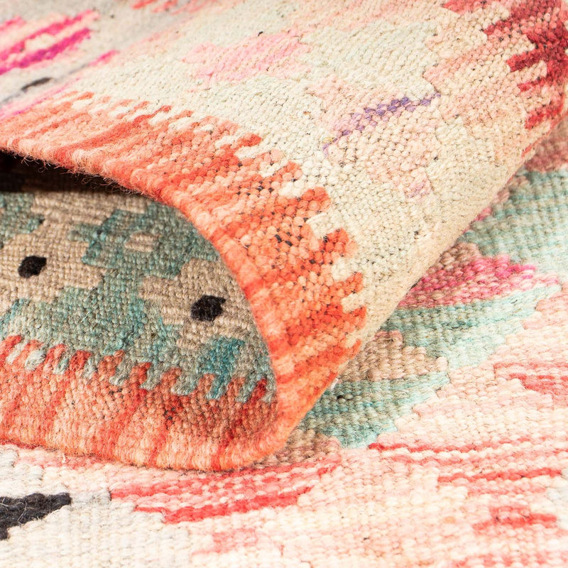 Dieser kunstvolle Kelim - Splash besticht das Auge mit seinen angesagten Farben. So bringt er eine moderne und harmonische Eleganz in Ihr Wohnambiente mit ein. Kelim Teppiche sind im Gegensatz zu klassischen Orientteppichen in traditioneller Art handgewebt statt geknüpft. In anderen Ländern werden diese Exemplare auch als Kissen oder Vorhänge genutzt. Diese Teppiche haben einen dünnen Flor, für das feste Obergewebe wird 100% Schurwolle verwendet, welche von Natur aus äußerst pflegeleicht und strapazierbar ist. Als echten Kelim bezeichnen Experten nur Teppiche, welche in der Türkei, dem Kaukasusgebiet, Persien, Afghanistan und Turkmenien hergestellt wurden. Echte Teppiche aus dem Orient eben.