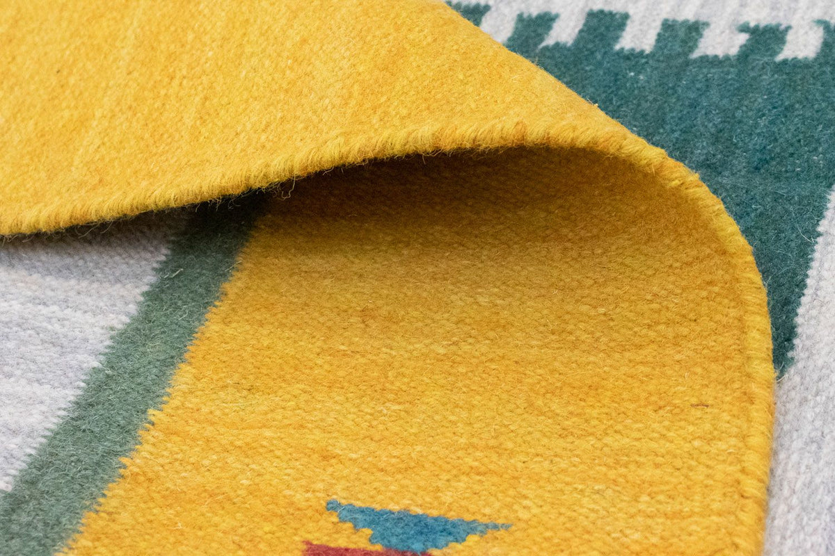Dieser kunstvolle Kelim - Trendy besticht das Auge mit seinen angesagten Farben. So bringt er eine moderne und harmonische Eleganz in Ihr Wohnambiente mit ein. Kelim Teppiche sind im Gegensatz zu klassischen Orientteppichen in traditioneller Art handgewebt statt geknüpft. In anderen Ländern werden diese Exemplare auch als Kissen oder Vorhänge genutzt. Diese Teppiche haben einen dünnen Flor, für das feste Obergewebe wird 100% Schurwolle verwendet, welche von Natur aus äußerst pflegeleicht und strapazierbar ist. Als echten Kelim bezeichnen Experten nur Teppiche, welche in der Türkei, dem Kaukasusgebiet, Persien, Afghanistan und Turkmenien hergestellt wurden. Echte Teppiche aus dem Orient eben.