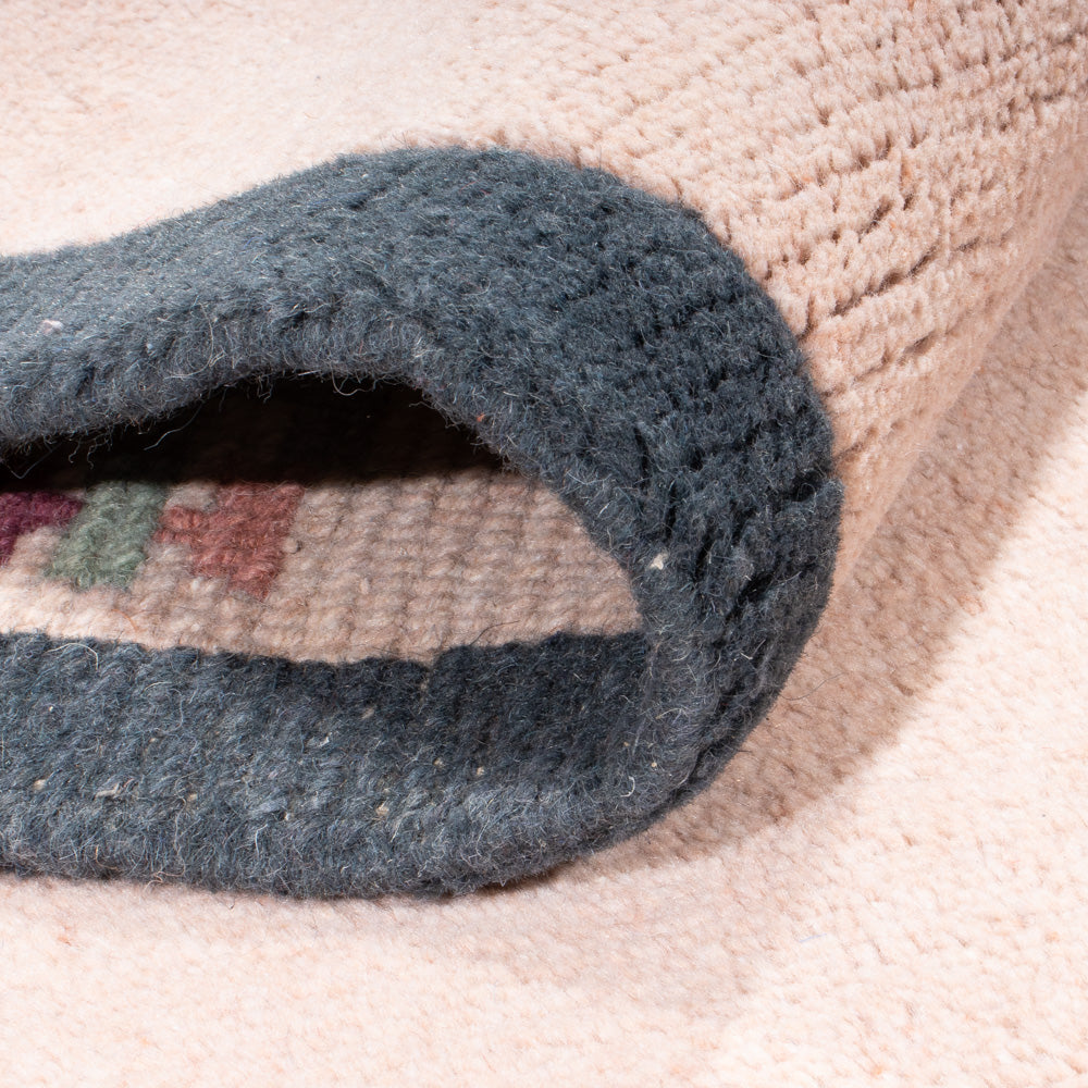 Die handgesponnene Wolle verleiht dem Teppich eine einzigartige, leicht strukturierte Oberfläche mit dezentem Glanz – ein Zeichen echter Handwerkskunst. Gleichzeitig wirkt das Material temperaturausgleichend, schmutzabweisend und sorgt für ein behagliches Raumklima.