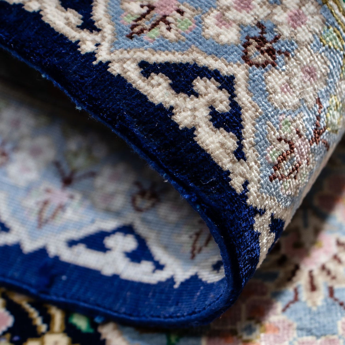 Diese wunderschönen Teppiche werden in der heiligen Stadt Ghom in Zentralpersien geknüpft. Der Ghom Teppich gehört zu den exklusivsten Knüpfkunstwerken des Orients. Es gibt ihn in drei Variationen: Korkwolle auf Baumwolle, Korkwolle mit Seide auf Baumwolle und Seide auf Seide. Selbst die Ghom Teppich-Variation Korkwolle auf Baumwolle ist hervorragend. Korkwolle stammt von der Schur des Lammhalses. Sie ist weich und fetthaltig, extrem schmutzabweisend und äußerst strapazierfähig. Aus der Korkwolle können besonders dünne Fäden gesponnen werden, die in dichten Knüpfknoten ein feines Gewebe ergeben. Die weiteren Ghom Teppich-Variationen sprechen für sich selbst. Je mehr Seidenanteil ein Teppich besitzt, umso feiner ist die Knüpfung, das Muster ist detaillierter, die Qualität des Teppichs ist höher.