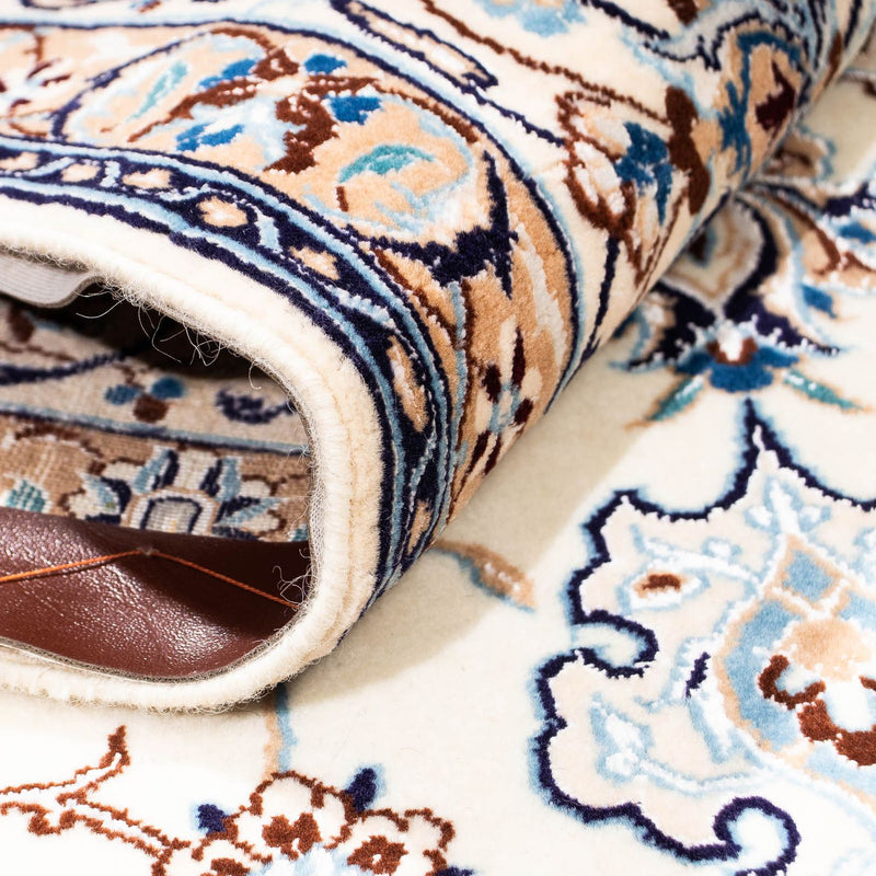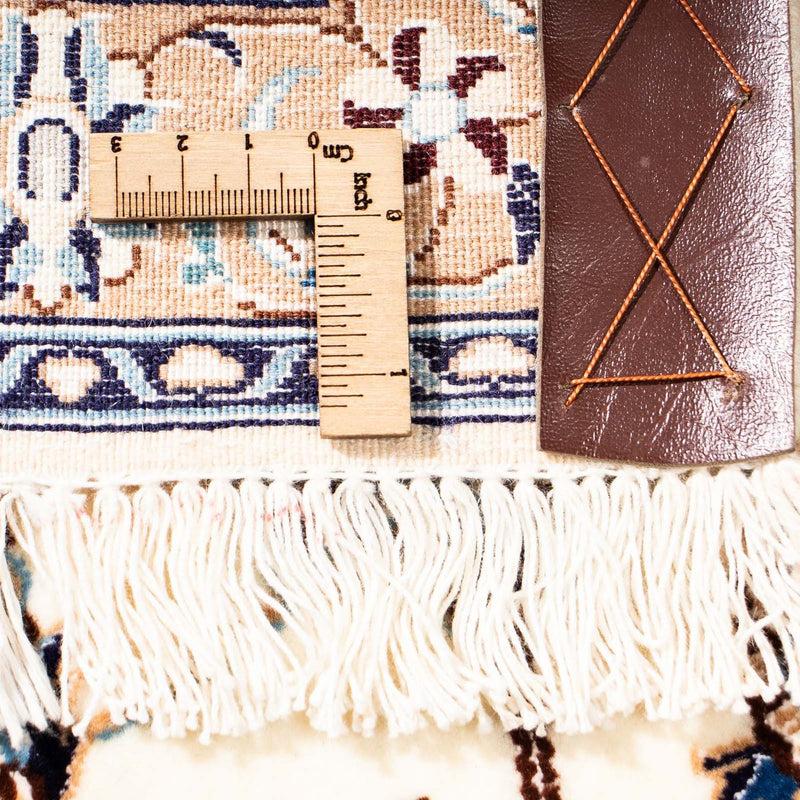 Dieser schöne und selten fein geknüpfte Perserteppich – Nain – Premium gehört zur höchsten Qualitätsstufe 4 mit circa 890.000 bis 1.000.000 Knoten pro Quadratmeter. Dem feinen Nain 6La, ist der Ruhm der Provenienz zu verdanken. Er gilt im gesamten Orient als besonders hochwertiger persischer Teppich. Nain Teppiche werden in hervorragender Feinheit geknüpft. Als Flormaterial wird meist beste, samtartige Korkwolle und immer Seide verwendet, damit eine exakte Musterung von Medaillons und All Over-Musterung ausgeführt werden kann. Man unterscheidet den Nain in 4 Qualitätsstufen, die in „La“ angegeben werden. 4La, 6La, 9La, 12La. Dies ist eine Qualitätsbezeichnung und bezieht sich auf die Anzahl der Fadenschichten, die in jedem Kettenfaden enthalten sind. Je geringerer die angegebene Zahl ist, desto feiner und dichter ist der Teppich. Nains gehören zu den Schönsten auf der Welt. Sie sind bei Sammlern sehr beliebt. Durch ihre schlichte Eleganz passen Nains auch in moderne Einrichtungen.