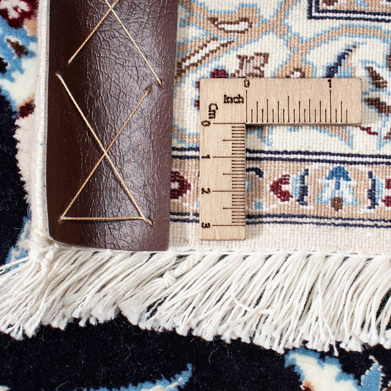 Dieser schöne und selten fein geknüpfte Perserteppich – Nain – Premium gehört zur höchsten Qualitätsstufe 4 mit circa 890.000 bis 1.000.000 Knoten pro Quadratmeter. Dem feinen Nain 6La, ist der Ruhm der Provenienz zu verdanken. Er gilt im gesamten Orient als besonders hochwertiger persischer Teppich. Nain Teppiche werden in hervorragender Feinheit geknüpft. Als Flormaterial wird meist beste, samtartige Korkwolle und immer Seide verwendet, damit eine exakte Musterung von Medaillons und All Over-Musterung ausgeführt werden kann. Man unterscheidet den Nain in 4 Qualitätsstufen, die in „La“ angegeben werden. 4La, 6La, 9La, 12La. Dies ist eine Qualitätsbezeichnung und bezieht sich auf die Anzahl der Fadenschichten, die in jedem Kettenfaden enthalten sind. Je geringerer die angegebene Zahl ist, desto feiner und dichter ist der Teppich. Nains gehören zu den Schönsten auf der Welt. Sie sind bei Sammlern sehr beliebt. Durch ihre schlichte Eleganz passen Nains auch in moderne Einrichtungen.