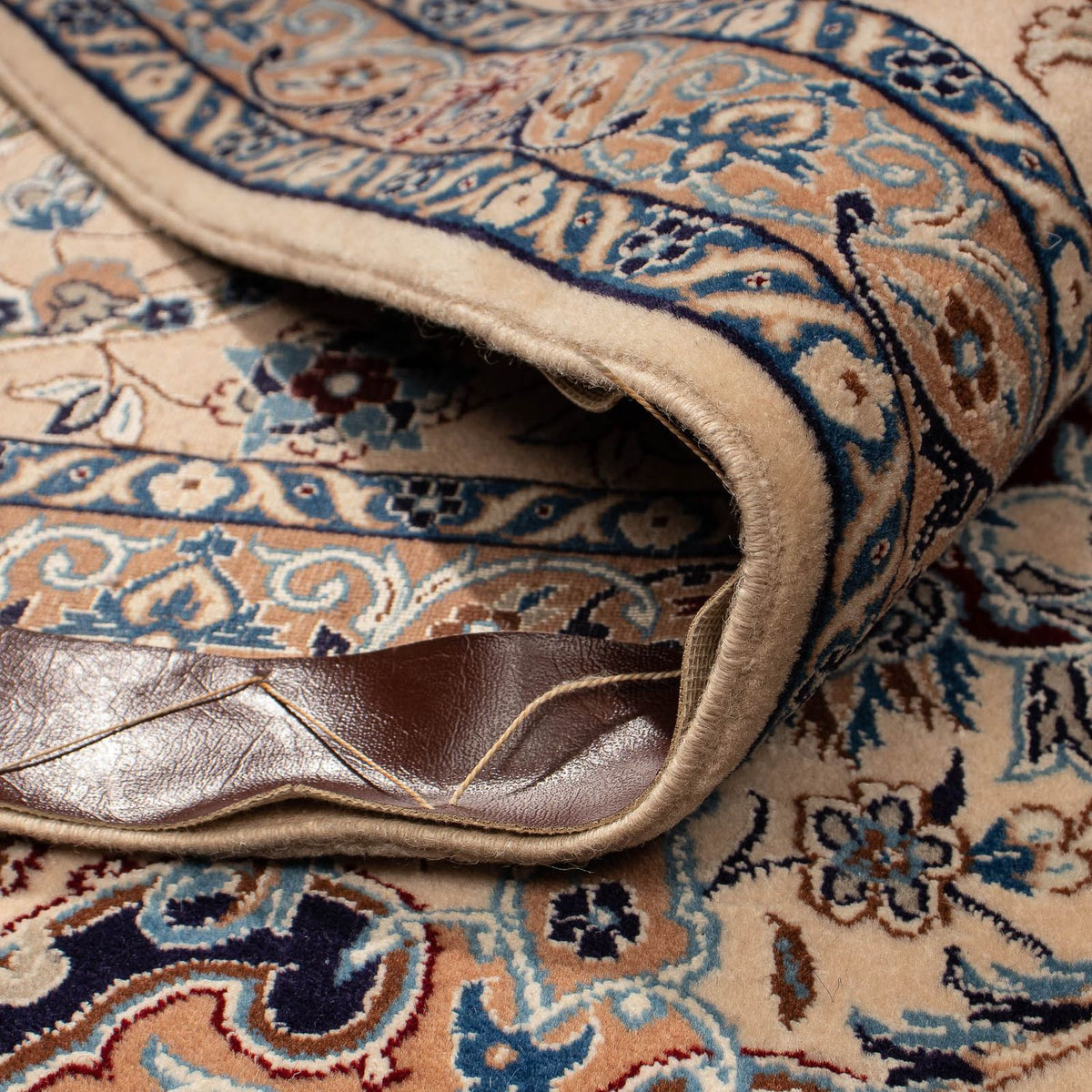 Dieser schöne und selten fein geknüpfte Perserteppich – Nain – Premium gehört zur höchsten Qualitätsstufe 4 mit circa 890.000 bis 1.000.000 Knoten pro Quadratmeter. Dem feinen Nain 6La, ist der Ruhm der Provenienz zu verdanken. Er gilt im gesamten Orient als besonders hochwertiger persischer Teppich. Nain Teppiche werden in hervorragender Feinheit geknüpft. Als Flormaterial wird meist beste, samtartige Korkwolle und immer Seide verwendet, damit eine exakte Musterung von Medaillons und All Over-Musterung ausgeführt werden kann. Man unterscheidet den Nain in 4 Qualitätsstufen, die in „La“ angegeben werden. 4La, 6La, 9La, 12La. Dies ist eine Qualitätsbezeichnung und bezieht sich auf die Anzahl der Fadenschichten, die in jedem Kettenfaden enthalten sind. Je geringerer die angegebene Zahl ist, desto feiner und dichter ist der Teppich. Nains gehören zu den Schönsten auf der Welt. Sie sind bei Sammlern sehr beliebt. Durch ihre schlichte Eleganz passen Nains auch in moderne Einrichtungen.