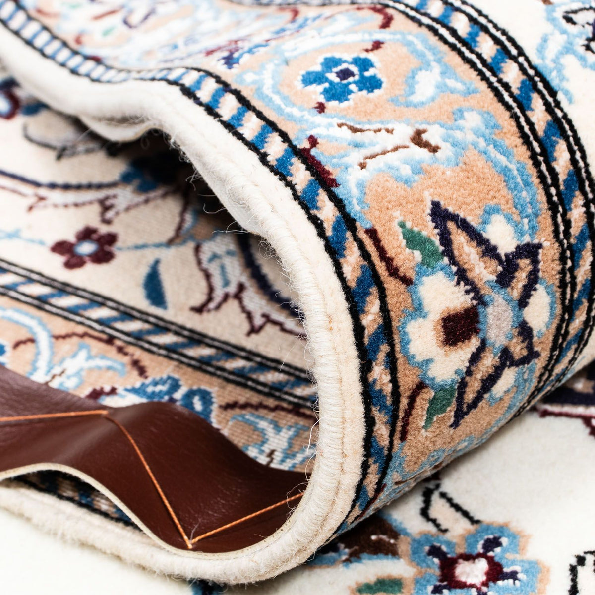 Dieser fein von Hand geknüpfte Nain 9La passt sich perfekt in Ihrem Zuhause an. Er besteht aus Korkwolle und feinster Seide, wodurch er sich besonders weich unter den Füßen anfühlt und durch seinen Glanz eine luxuriöse Atmosphäre schafft. Der Perserteppich – Nain – Royal gehört zu der hohen Qualitätsstufe 3 mit circa 250.000 bis 360.000 Knoten pro Quadratmeter. Das heißt, dass er sehr dicht ist und so eine Langlebigkeit garantiert. Egal, welchen Einrichtungsstil sie bei sich im Haus bevorzugen – mit einem Nain Teppich treffen Sie immer die richtige Wahl.