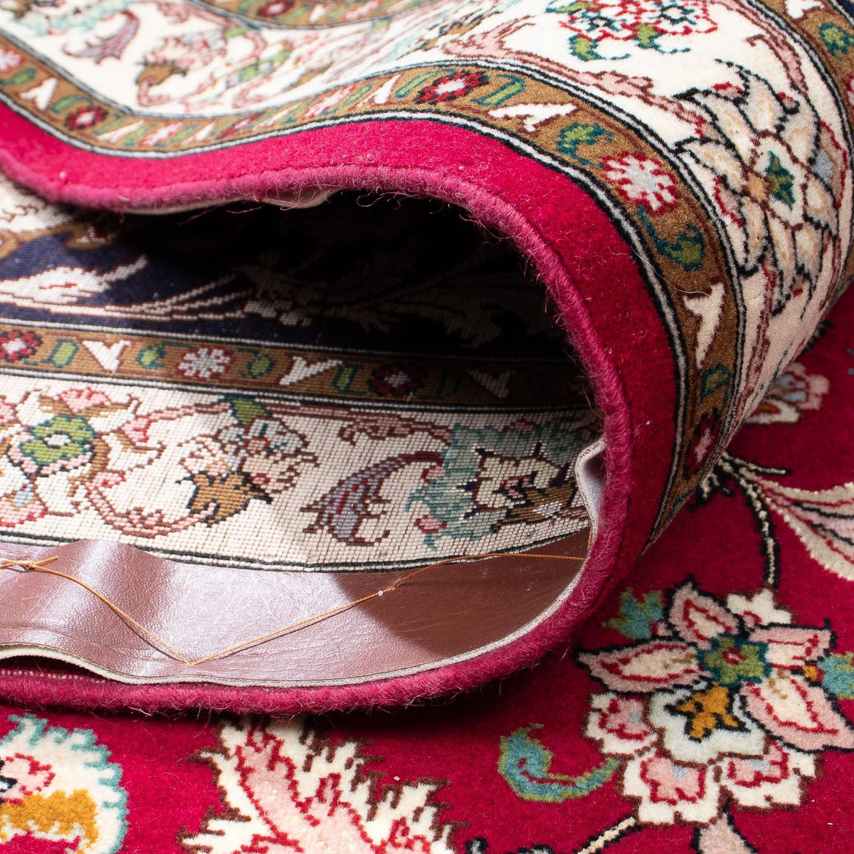 Dieser fein geknüpfte Perserteppich - Täbriz – Royal ist mit hochwertiger Korkwolle, in sorgfältiger und fehlerfreier Handarbeit gefertigt. Der Täbriz 40 Raj gehört zu den schönsten seiner Klasse. Diese Teppiche begründeten den guten Ruf der persischen Knüpfkunst. Er ist ein sehr beliebter Teppich aus einem der besten Knüpfgebiete Persiens. Sie haben oft ein großes, zentral platziertes Medaillon aus schönen Blumenmotiven, ein typisch orientalisches Motiv. Täbriz-Teppiche haben häufig die zusätzliche Bezeichnung Raj. Man unterscheidet zwischen 40, 50, 60, 70, 80 Raj. Je höher die angegebene Zahl ist, desto feiner und dichter ist der Teppich geknüpft. Raj ist eine Qualitätsbezeichnung und bezieht sich auf die Anzahl der Knoten auf einer Breite von ca. 70 mm. Aufgrund der dichten Knüpfung ist der Teppich strapazierfähig, unempfindlich und auch für extreme Benutzung gut geeignet. Klassische Eleganz und Farb-Opulenz zeichnen diesen edlen Teppich aus.