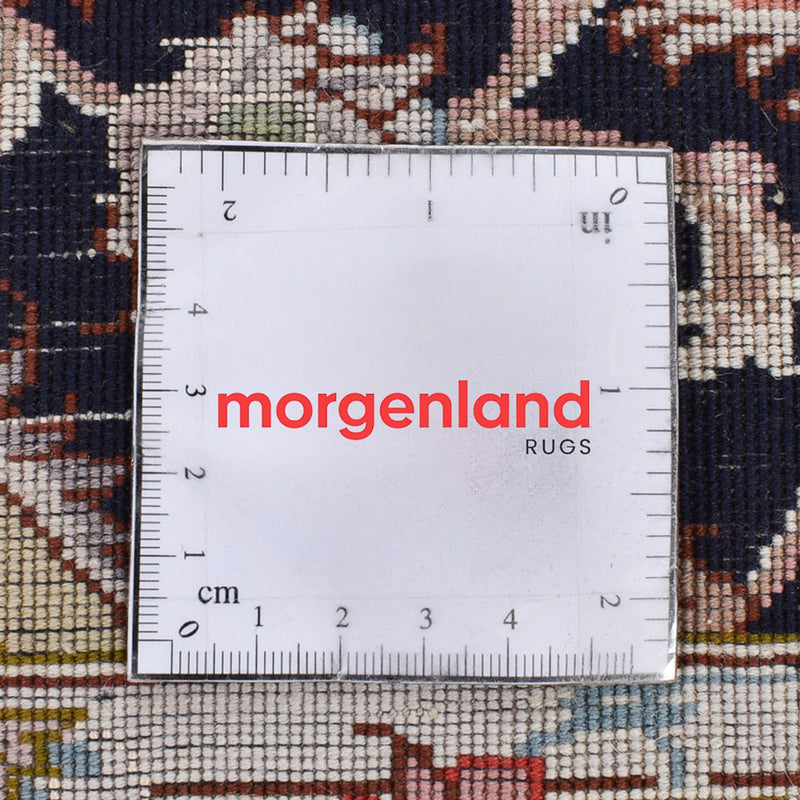Dieser schöne und selten fein geknüpfte Perserteppich - Täbriz – Premium ist mit hochwertiger Korkwolle und glänzender Seide, in sorgfältiger und fehlerfreier Handarbeit gefertigt. Der Täbriz 60 Raj gehört zu den schönsten seiner Klasse. Diese Teppiche begründeten den guten Ruf der persischen Knüpfkunst. Er ist ein sehr beliebter Teppich aus einem der besten Knüpfgebiete Persiens. Sie haben oft ein großes, zentral platziertes Medaillon aus schönen Blumenmotiven, ein typisch orientalisches Motiv. Täbriz-Teppiche haben häufig die zusätzliche Bezeichnung Raj. Man unterscheidet zwischen 40, 50, 60, 70, 80 Raj. Je höher die angegebene Zahl ist, desto feiner und dichter ist der Teppich geknüpft. Raj ist eine Qualitätsbezeichnung und bezieht sich auf die Anzahl der Knoten auf einer Breite von ca. 70 mm. Aufgrund der dichten Knüpfung ist der Teppich strapazierfähig, unempfindlich und auch für extreme Benutzung gut geeignet. Klassische Eleganz und Farb-Opulenz zeichnen diesen edlen Teppich aus. Dieses Exemplar ist Langlebig und eignet sich perfekt als Investition oder langfristige Kapitaleinlage.