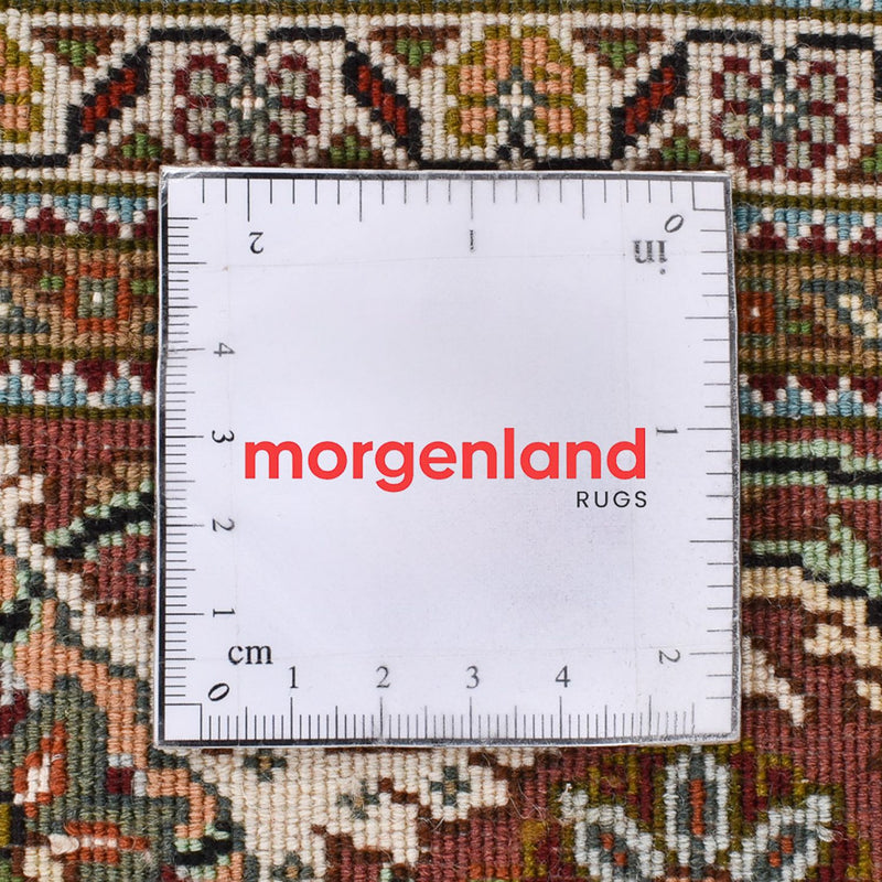 Dieser fein geknüpfte Perserteppich - Täbriz – Royal ist mit hochwertiger Korkwolle, in sorgfältiger und fehlerfreier Handarbeit gefertigt. Der Täbriz 40 Raj gehört zu den schönsten seiner Klasse. Diese Teppiche begründeten den guten Ruf der persischen Knüpfkunst. Er ist ein sehr beliebter Teppich aus einem der besten Knüpfgebiete Persiens. Sie haben oft ein großes, zentral platziertes Medaillon aus schönen Blumenmotiven, ein typisch orientalisches Motiv. Täbriz-Teppiche haben häufig die zusätzliche Bezeichnung Raj. Man unterscheidet zwischen 40, 50, 60, 70, 80 Raj. Je höher die angegebene Zahl ist, desto feiner und dichter ist der Teppich geknüpft. Raj ist eine Qualitätsbezeichnung und bezieht sich auf die Anzahl der Knoten auf einer Breite von ca. 70 mm. Aufgrund der dichten Knüpfung ist der Teppich strapazierfähig, unempfindlich und auch für extreme Benutzung gut geeignet. Klassische Eleganz und Farb-Opulenz zeichnen diesen edlen Teppich aus.