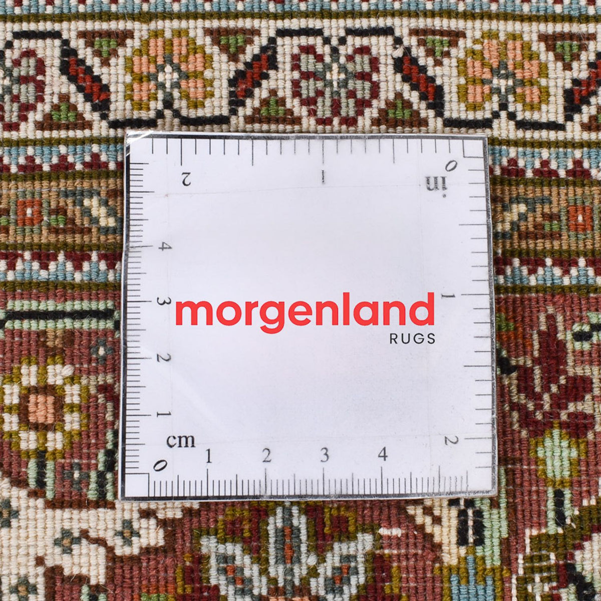 Dieser fein geknüpfte Perserteppich - Täbriz – Royal ist mit hochwertiger Korkwolle, in sorgfältiger und fehlerfreier Handarbeit gefertigt. Der Täbriz 40 Raj gehört zu den schönsten seiner Klasse. Diese Teppiche begründeten den guten Ruf der persischen Knüpfkunst. Er ist ein sehr beliebter Teppich aus einem der besten Knüpfgebiete Persiens. Sie haben oft ein großes, zentral platziertes Medaillon aus schönen Blumenmotiven, ein typisch orientalisches Motiv. Täbriz-Teppiche haben häufig die zusätzliche Bezeichnung Raj. Man unterscheidet zwischen 40, 50, 60, 70, 80 Raj. Je höher die angegebene Zahl ist, desto feiner und dichter ist der Teppich geknüpft. Raj ist eine Qualitätsbezeichnung und bezieht sich auf die Anzahl der Knoten auf einer Breite von ca. 70 mm. Aufgrund der dichten Knüpfung ist der Teppich strapazierfähig, unempfindlich und auch für extreme Benutzung gut geeignet. Klassische Eleganz und Farb-Opulenz zeichnen diesen edlen Teppich aus.