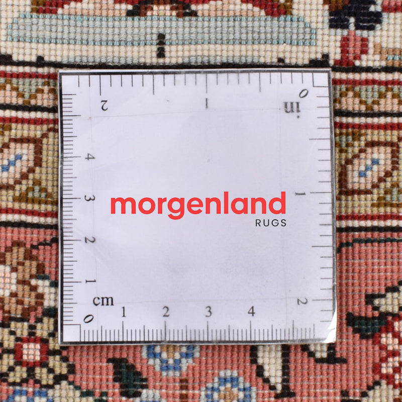Dieser fein geknüpfte Perserteppich - Täbriz – Royal ist mit hochwertiger Korkwolle, in sorgfältiger und fehlerfreier Handarbeit gefertigt. Der Täbriz 40 Raj gehört zu den schönsten seiner Klasse. Diese Teppiche begründeten den guten Ruf der persischen Knüpfkunst. Er ist ein sehr beliebter Teppich aus einem der besten Knüpfgebiete Persiens. Sie haben oft ein großes, zentral platziertes Medaillon aus schönen Blumenmotiven, ein typisch orientalisches Motiv. Täbriz-Teppiche haben häufig die zusätzliche Bezeichnung Raj. Man unterscheidet zwischen 40, 50, 60, 70, 80 Raj. Je höher die angegebene Zahl ist, desto feiner und dichter ist der Teppich geknüpft. Raj ist eine Qualitätsbezeichnung und bezieht sich auf die Anzahl der Knoten auf einer Breite von ca. 70 mm. Aufgrund der dichten Knüpfung ist der Teppich strapazierfähig, unempfindlich und auch für extreme Benutzung gut geeignet. Klassische Eleganz und Farb-Opulenz zeichnen diesen edlen Teppich aus.