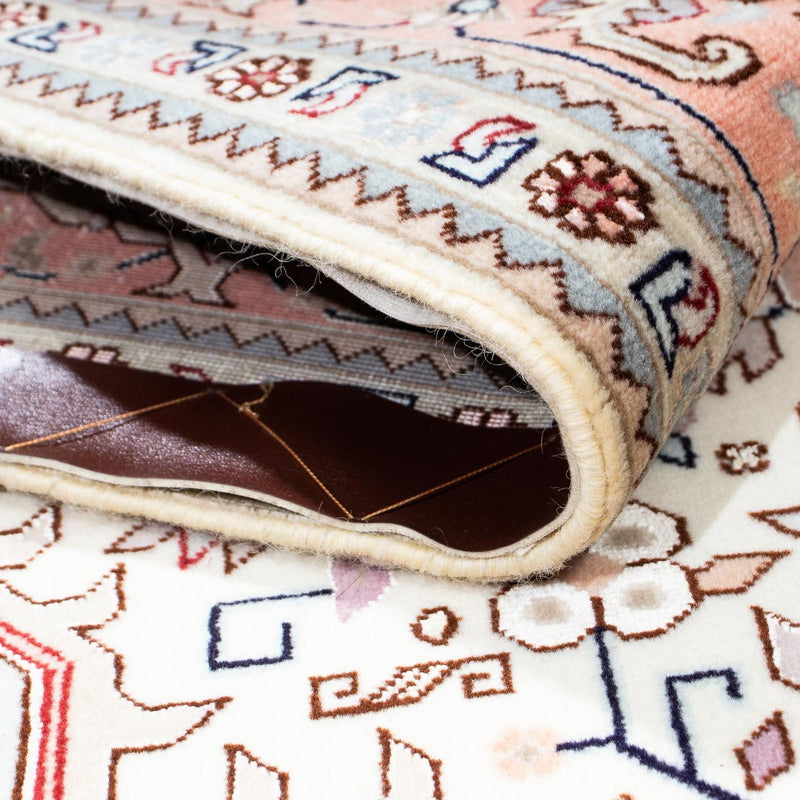 Dieser fein geknüpfte Perserteppich - Täbriz – Royal ist mit hochwertiger Korkwolle, in sorgfältiger und fehlerfreier Handarbeit gefertigt. Der Täbriz 40 Raj gehört zu den schönsten seiner Klasse. Diese Teppiche begründeten den guten Ruf der persischen Knüpfkunst. Er ist ein sehr beliebter Teppich aus einem der besten Knüpfgebiete Persiens. Sie haben oft ein großes, zentral platziertes Medaillon aus schönen Blumenmotiven, ein typisch orientalisches Motiv. Täbriz-Teppiche haben häufig die zusätzliche Bezeichnung Raj. Man unterscheidet zwischen 40, 50, 60, 70, 80 Raj. Je höher die angegebene Zahl ist, desto feiner und dichter ist der Teppich geknüpft. Raj ist eine Qualitätsbezeichnung und bezieht sich auf die Anzahl der Knoten auf einer Breite von ca. 70 mm. Aufgrund der dichten Knüpfung ist der Teppich strapazierfähig, unempfindlich und auch für extreme Benutzung gut geeignet. Klassische Eleganz und Farb-Opulenz zeichnen diesen edlen Teppich aus.