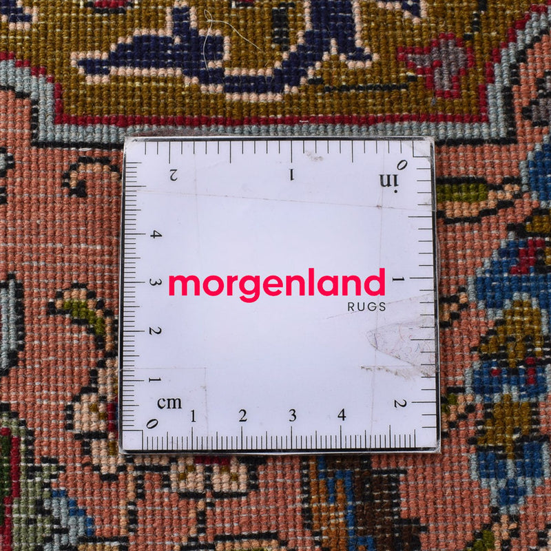 Dieser fein geknüpfte Perserteppich - Täbriz – Royal ist mit hochwertiger Korkwolle, in sorgfältiger und fehlerfreier Handarbeit gefertigt. Der Täbriz 40 Raj gehört zu den schönsten seiner Klasse. Diese Teppiche begründeten den guten Ruf der persischen Knüpfkunst. Er ist ein sehr beliebter Teppich aus einem der besten Knüpfgebiete Persiens. Sie haben oft ein großes, zentral platziertes Medaillon aus schönen Blumenmotiven, ein typisch orientalisches Motiv. Täbriz-Teppiche haben häufig die zusätzliche Bezeichnung Raj. Man unterscheidet zwischen 40, 50, 60, 70, 80 Raj. Je höher die angegebene Zahl ist, desto feiner und dichter ist der Teppich geknüpft. Raj ist eine Qualitätsbezeichnung und bezieht sich auf die Anzahl der Knoten auf einer Breite von ca. 70 mm. Aufgrund der dichten Knüpfung ist der Teppich strapazierfähig, unempfindlich und auch für extreme Benutzung gut geeignet. Klassische Eleganz und Farb-Opulenz zeichnen diesen edlen Teppich aus.