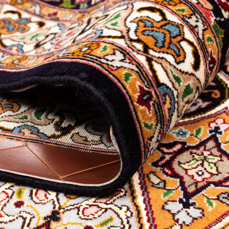Dieser fein geknüpfte Perserteppich - Täbriz – Royal ist mit hochwertiger Korkwolle, in sorgfältiger und fehlerfreier Handarbeit gefertigt. Der Täbriz 40 Raj gehört zu den schönsten seiner Klasse. Diese Teppiche begründeten den guten Ruf der persischen Knüpfkunst. Er ist ein sehr beliebter Teppich aus einem der besten Knüpfgebiete Persiens. Sie haben oft ein großes, zentral platziertes Medaillon aus schönen Blumenmotiven, ein typisch orientalisches Motiv. Täbriz-Teppiche haben häufig die zusätzliche Bezeichnung Raj. Man unterscheidet zwischen 40, 50, 60, 70, 80 Raj. Je höher die angegebene Zahl ist, desto feiner und dichter ist der Teppich geknüpft. Raj ist eine Qualitätsbezeichnung und bezieht sich auf die Anzahl der Knoten auf einer Breite von ca. 70 mm. Aufgrund der dichten Knüpfung ist der Teppich strapazierfähig, unempfindlich und auch für extreme Benutzung gut geeignet. Klassische Eleganz und Farb-Opulenz zeichnen diesen edlen Teppich aus.