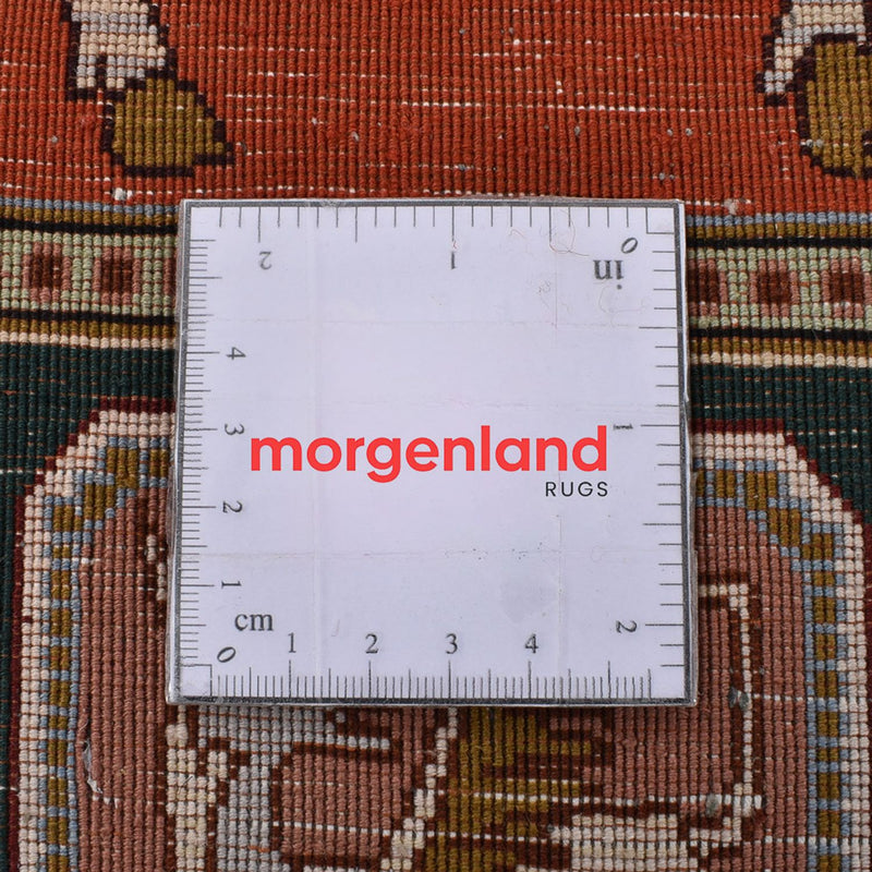 Dieser fein geknüpfte Perserteppich - Täbriz – Royal ist mit hochwertiger Korkwolle, in sorgfältiger und fehlerfreier Handarbeit gefertigt. Der Täbriz 40 Raj gehört zu den schönsten seiner Klasse. Diese Teppiche begründeten den guten Ruf der persischen Knüpfkunst. Er ist ein sehr beliebter Teppich aus einem der besten Knüpfgebiete Persiens. Sie haben oft ein großes, zentral platziertes Medaillon aus schönen Blumenmotiven, ein typisch orientalisches Motiv. Täbriz-Teppiche haben häufig die zusätzliche Bezeichnung Raj. Man unterscheidet zwischen 40, 50, 60, 70, 80 Raj. Je höher die angegebene Zahl ist, desto feiner und dichter ist der Teppich geknüpft. Raj ist eine Qualitätsbezeichnung und bezieht sich auf die Anzahl der Knoten auf einer Breite von ca. 70 mm. Aufgrund der dichten Knüpfung ist der Teppich strapazierfähig, unempfindlich und auch für extreme Benutzung gut geeignet. Klassische Eleganz und Farb-Opulenz zeichnen diesen edlen Teppich aus.