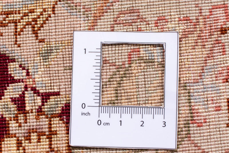 Dieser fein geknüpfte Perserteppich - Täbriz – Royal ist mit hochwertiger Korkwolle, in sorgfältiger und fehlerfreier Handarbeit gefertigt. Der Täbriz 40 Raj gehört zu den schönsten seiner Klasse. Diese Teppiche begründeten den guten Ruf der persischen Knüpfkunst. Er ist ein sehr beliebter Teppich aus einem der besten Knüpfgebiete Persiens. Sie haben oft ein großes, zentral platziertes Medaillon aus schönen Blumenmotiven, ein typisch orientalisches Motiv. Täbriz-Teppiche haben häufig die zusätzliche Bezeichnung Raj. Man unterscheidet zwischen 40, 50, 60, 70, 80 Raj. Je höher die angegebene Zahl ist, desto feiner und dichter ist der Teppich geknüpft. Raj ist eine Qualitätsbezeichnung und bezieht sich auf die Anzahl der Knoten auf einer Breite von ca. 70 mm. Aufgrund der dichten Knüpfung ist der Teppich strapazierfähig, unempfindlich und auch für extreme Benutzung gut geeignet. Klassische Eleganz und Farb-Opulenz zeichnen diesen edlen Teppich aus.